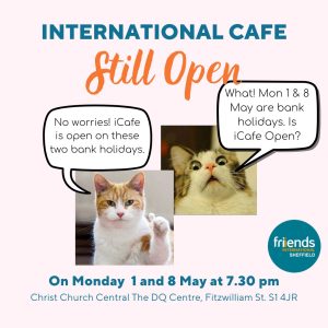 The International Cafe is still open on Monday 1 and 8 May, these two bank holidays.